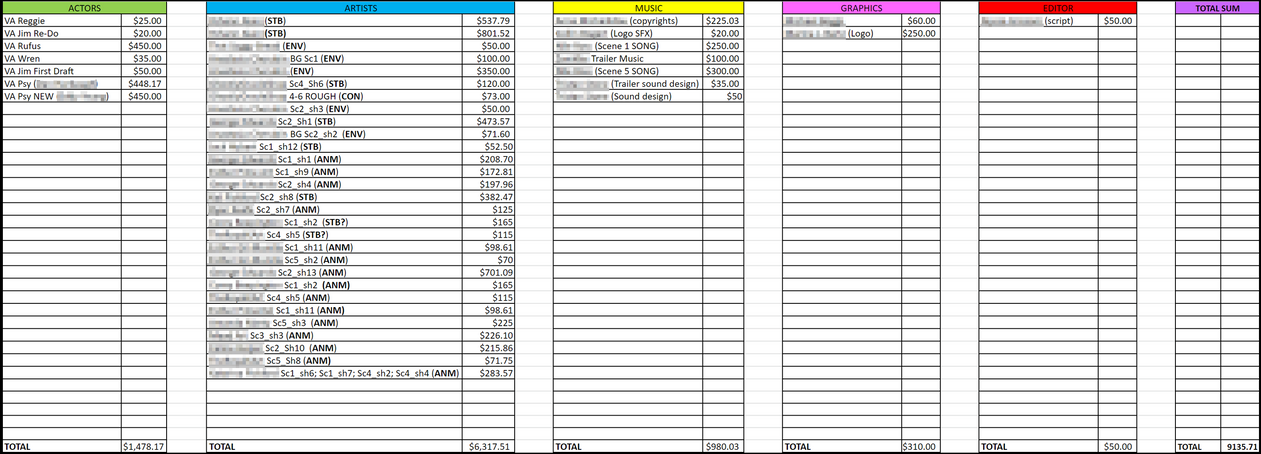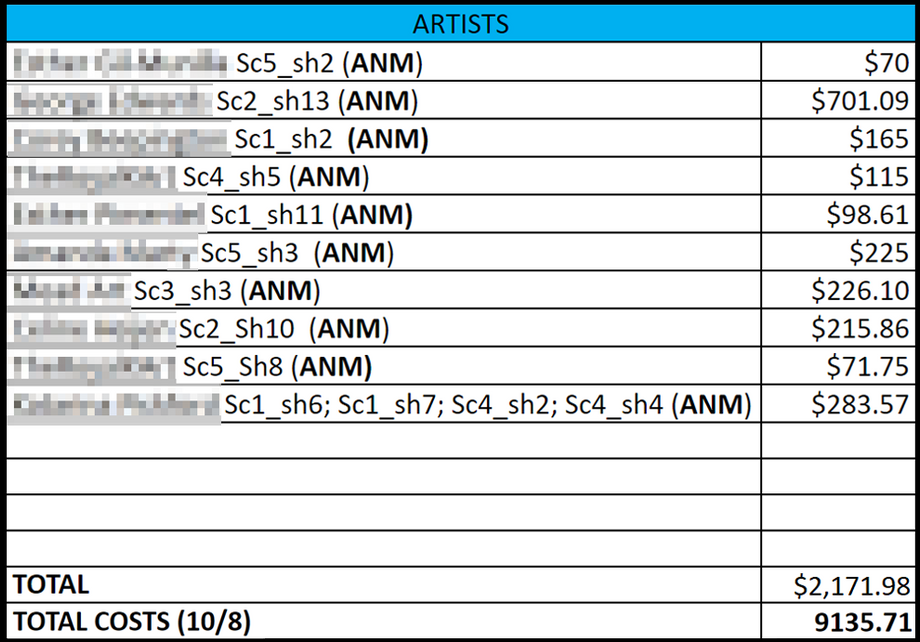This phase, only animators were assigned work so we did not spend any funds on graphics, music, or actors. The first table listed below shows the payments made after 8/30. The second table shows the same data included with the previous entries made in Phase 01, and it calculates the current total costs.
